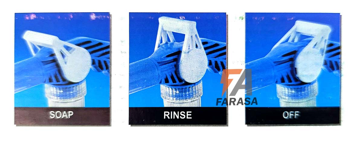 این کارواش مجهز به یک (محفظه داخلی) است که میتوانید مواد شوینده را بهسادگی در آن بریزید. با اتصال دستگاه به شیلنگ، آب شهری به صورت خودکار با محلول ترکیب شده و شستوشویی مؤثر ایجاد میکند. روی (ضامن دستگاه) سه حالت قابل انتخاب وجود دارد: