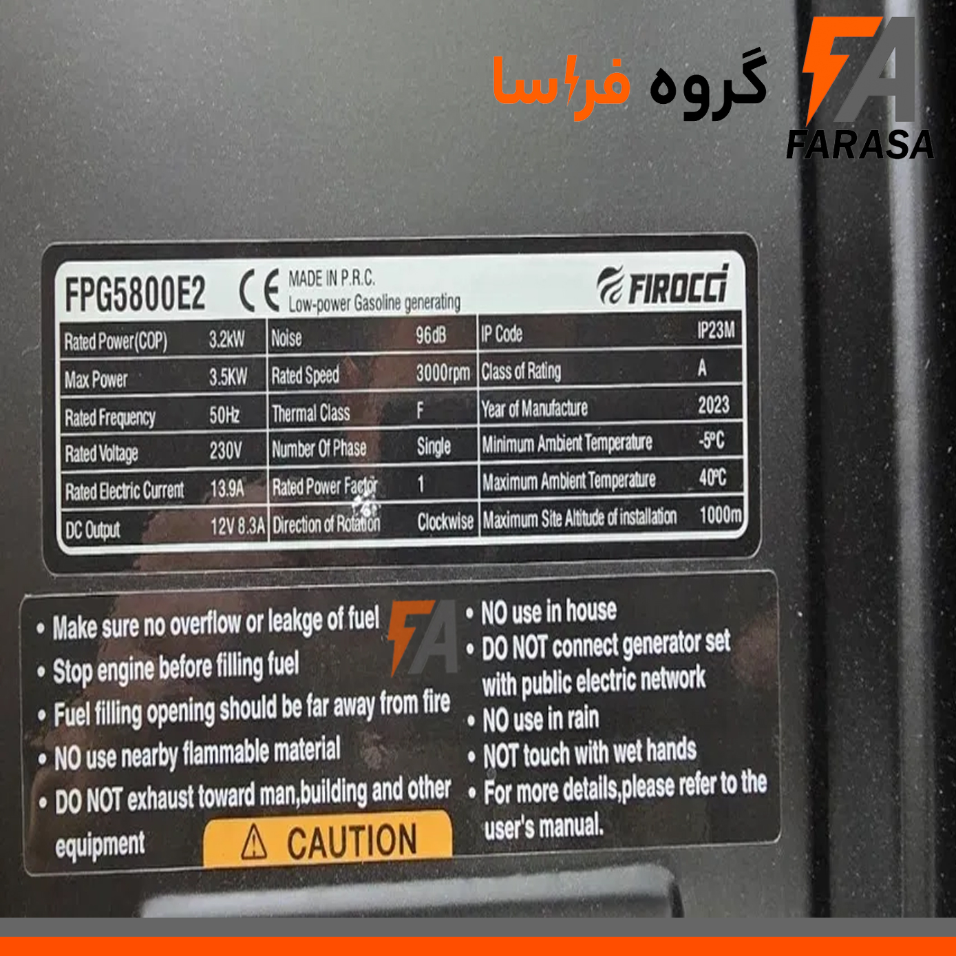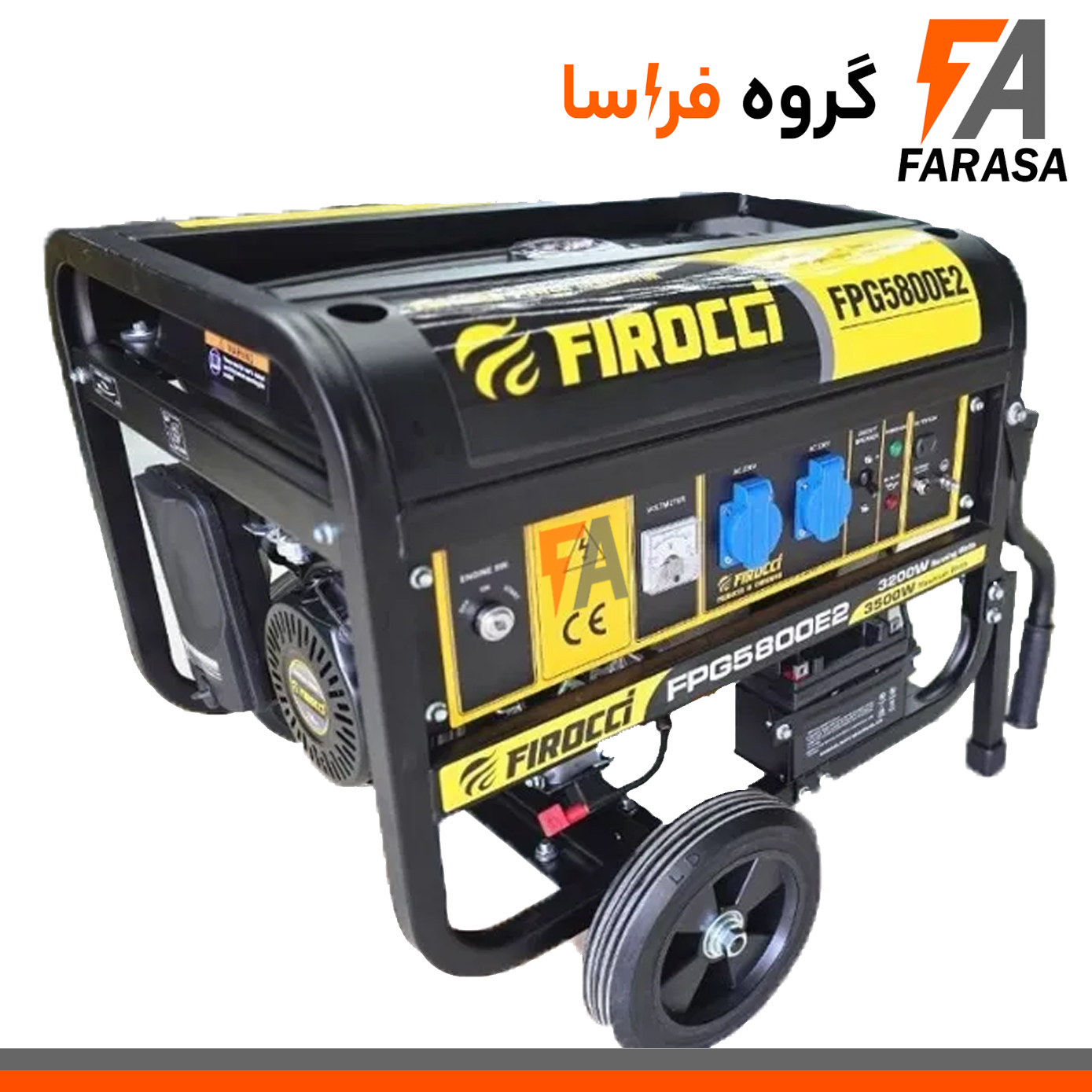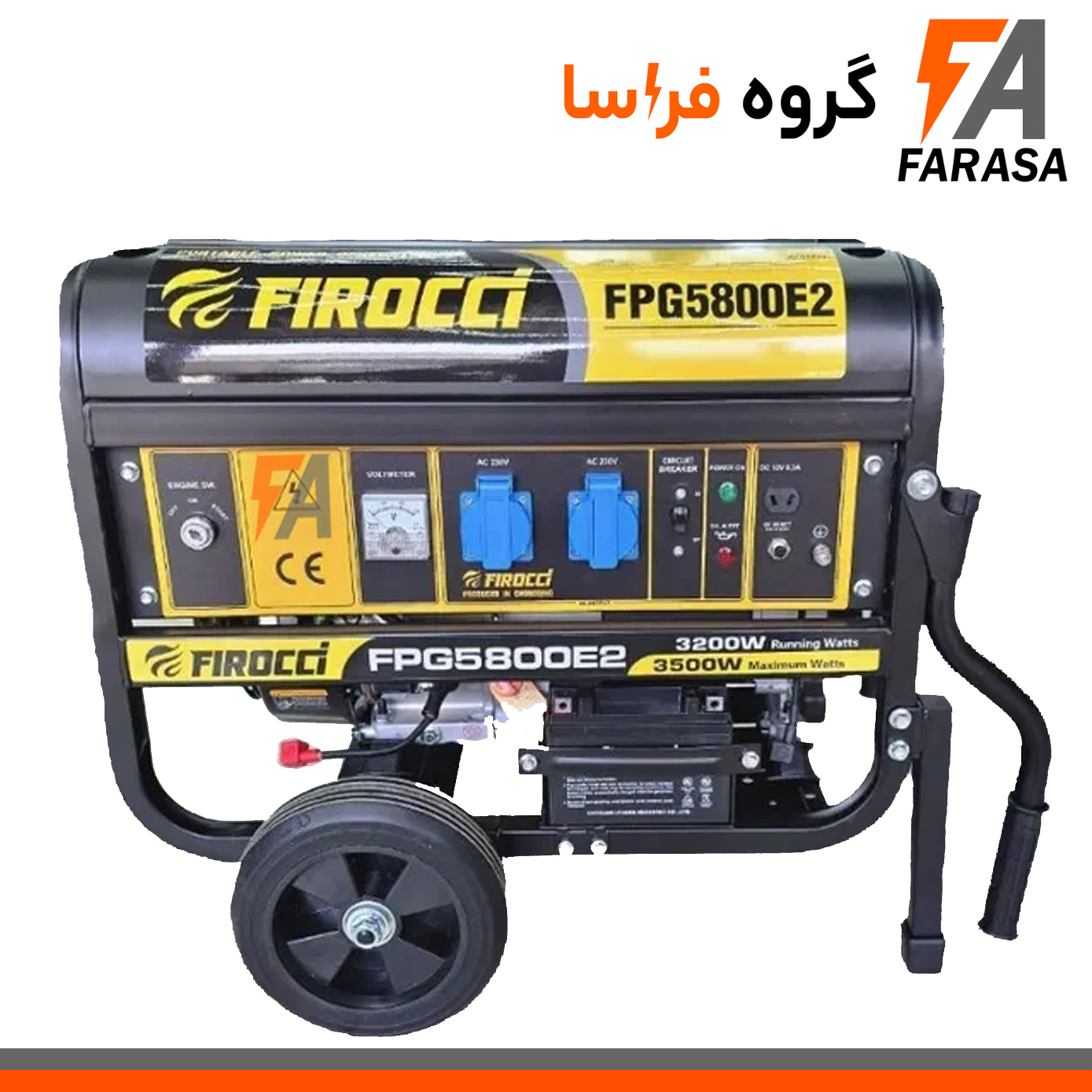 برند firocci ساخت کمپانی معتبر azp navigator به سفارش امارات بوده و دارای موتور بزرگ،سیم پیچ۱۰۰ درصد مس و طراحی بادوام و قابل اطمینان می باشد. موتور برق فیروکسی مدل FPG5800E2 یک موتور برق نیمه صنعتی با شاسی و موتور قوی همراه با استارت الکتریکی وسیستم تنظیم ولتاژAVR می باشد.این موتور برق دارای چرخ و دسته برای حمل ، 3500 وات حداکثر توان خروجی و وزن حدود 60 کیلو انتخابی ایدهآل برای تأمین برق پایدار و مطمئن می باشد. با قدرت بالا و عملکردی بینظیر مناسب برای مصارف خانگی و نیمه صنعتی است.