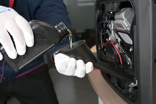 به مقدار درجشده در دفترچه راهنما (مثلاً ۰/۶ لیتر یا ۰/۸ لیتر)، روغن مناسب بریزید.(معمولا سطح روغن می بایست تا زیر رزوه های لوله ورودی روغن بیاید).