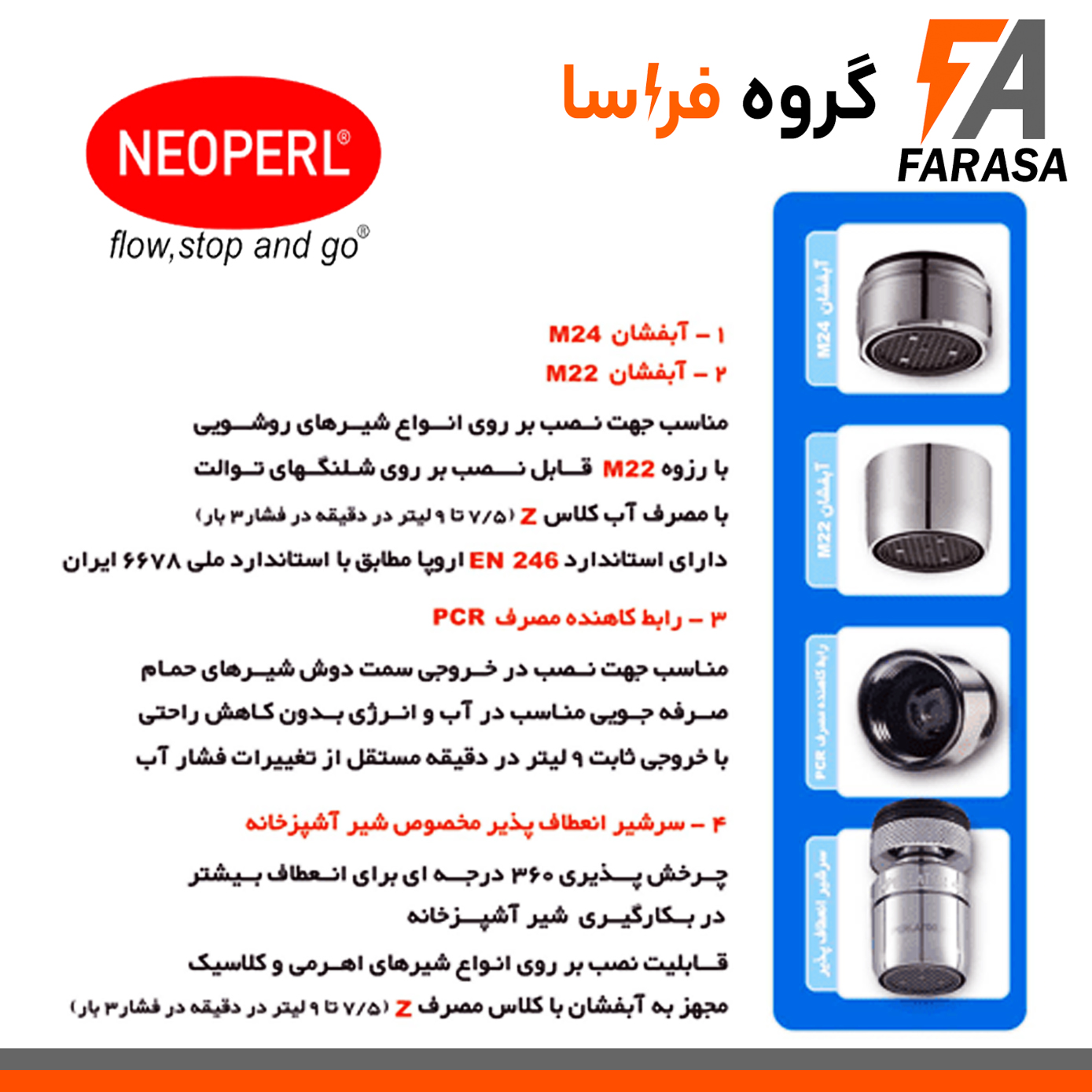 با بسته کاهنده مصرف آب نئوپرل، مصرف آب خود را بهینه کنید و در هزینهها صرفهجویی کنید. این بسته حاوی سر شیر های کاهنده مصرف آب نئوپرل آلمان با فناوری هوا مخلوط با ساختار مستحکم لانه زنبوری ( مقاوم در مقابل رسوب) ، دوام و عملکرد استثنایی را تضمین میکند. نصب آسان، مناسب برای انواع شیرآلات و بهترین انتخاب برای حفظ محیطزیست و کاهش هزینههای شما. این بسته شامل : یک عدد پرلاتور مفصلی گردان برای آشپزخانه - یک عدد پرلاتور رزوه داخل برای شلنگ توالت - یک عدد پرلاتور رزوه خارج برای روشویی - یک عدد رگولاتور مخصوص شیر حمام می باشد. برند “نئوپرل” در سال 1952 در زمینهی طراحی و تولید سرشیرهای کاهنده فعالیت خود را آغاز نمود. این برند در راستای پیشبرد اهداف خود که کارآفرینی و شناساندن طروق کاهش مصرف آب در دنیا است، با ایجاد کارخانهای در یکی از شهرهای مرزی آلمان فعالیت خود را ادامه داده و سعی بر تولید محصولات متنوع با مواد اولیهی مرغوب را داشته است.