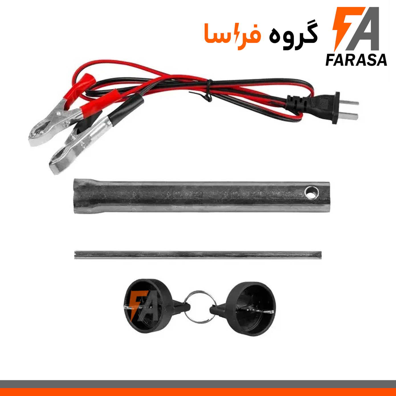 دوشاخه برق، آچار شمع، یک عدد میله ، دو عدد کلید، یک ست چرخ و دستگیره