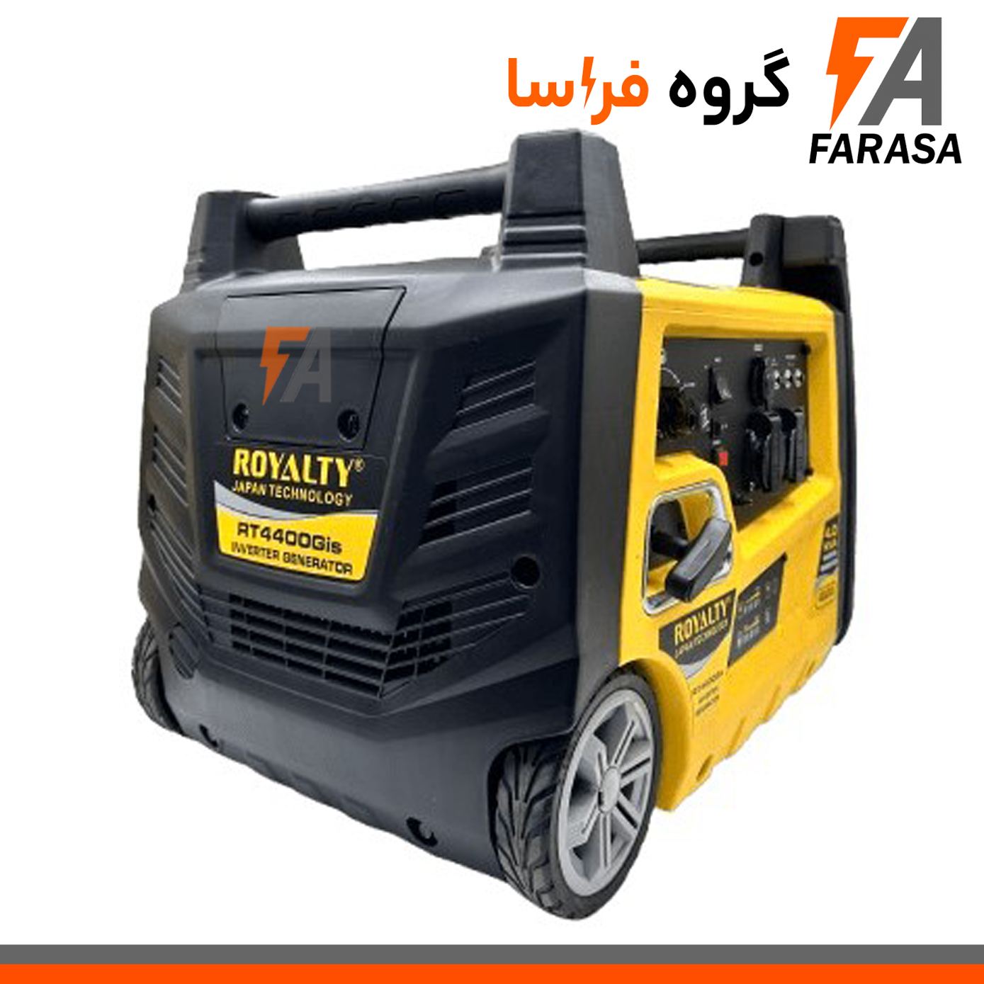 رویالتی Royalty یکی از برندهای معتبر تولید کننده موتورهای صنعتی و ژنراتورهای برق به شمار می رود که به دلیل کیفیت ساخت خوب(دارنده گواهینامه ایزو 9001 و نشان CE اروپا) و استفاده از تکنولوژی ژاپنی و سیم پیچ تمام مس ،سالهاست که بین مشتریان محبوبیت یافته و جزو پر فروش ترین موتور برق های بازار جهانی مخصوصا آسیا و ایران می باشد .موتور برق سایلنت اینورتری 4 کاوا (4 کیلووات) رویالتی Royalty مدل RT4400Gis، توانایی تامین برقی بدون نوسان و با صدای کم را دارد.این مدل همانند دیگر سری های سایلنت رویالتی، شدت صدای پایینی دارد که امکان استفاده از آن در محیط های مسکونی یا فضا های آرام مانند منازل،ویلاها،مغازه ها، غرفه های نمایشگاهی و حتی کمپینگ را فراهم می کند. همچنین وجود سیستم اینورتر و تنظیم اتوماتیک ولتاژ (AVR) باعث ثبات ولتاژ و فرکانس برق شده و از آسیب به لوازم برقی حساس جلوگیری می کند.